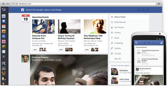Facebook News Feedเมื่อวันที่ 7 มีนาคมที่ผ่านมา เฟซบุ๊ก (Facebook) ได้จัดงานอีเว้นท์พร้อมกับเชิญสื่อต่าง ๆ มาร่วมงาน โดยไฮไลท์สำคัญของงานนี้ก็คือการเปิดตัวหน้า News Feed (รวมข่าว) ที่มาพร้อมดีไซน์แบบใหม่ เน้นอวดรูปภาพและแสดงเนื้อหาที่โดดเด่นมากกว่าเดิม ซึ่งรูปแบบหน้า News Feed แบบใหม่จะสอดคล้องกับหน้าเว็บในเวอร์ชั่นมือถือมากขึ้น